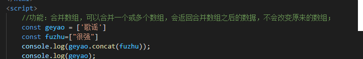 //功能:合并数组,可以合并一个或多个数组,会返回合并数组之后的数据,不会改变原来的数组; const geyao = ['歌谣'] const fuzhu=["很强"] console.log(geyao.concat(fuzhu)); console.log(geyao);
