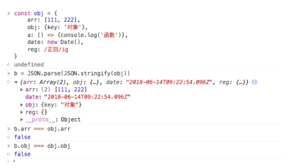 可以从中看出,obj中的普通对象和数组都能拷贝,然而date对象成了字符串,函数直接就不见了,正则成了一个空对象。