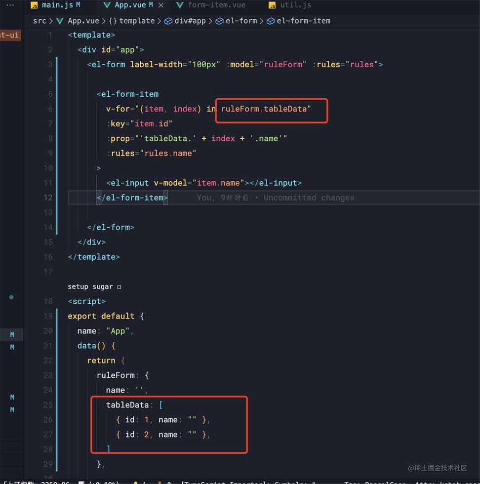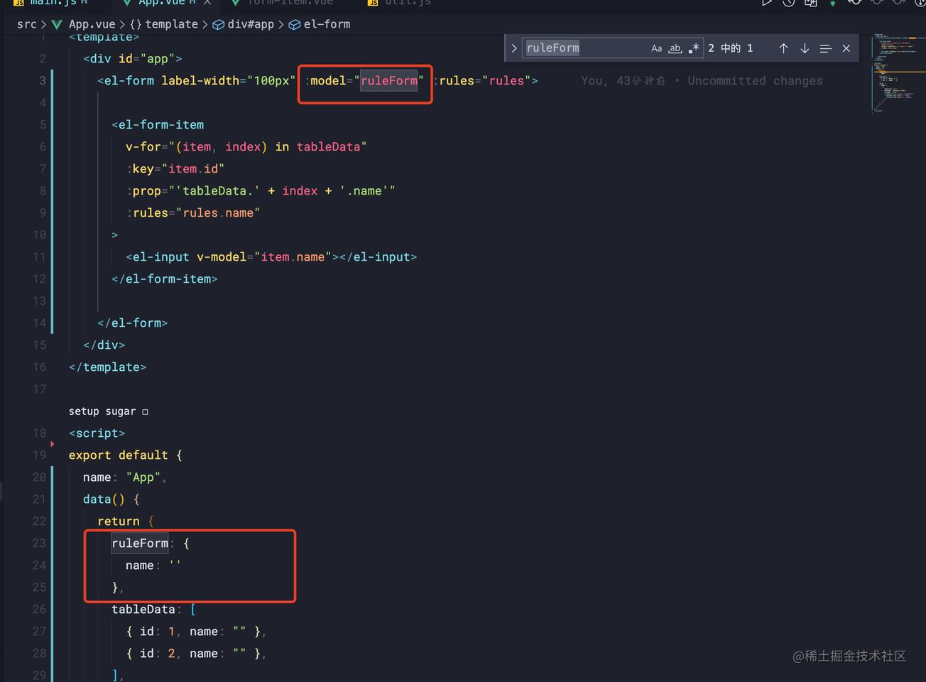 我们只需要将tableData移到ruleForm中即可, 然后我们再来看控制台已经不报错了。