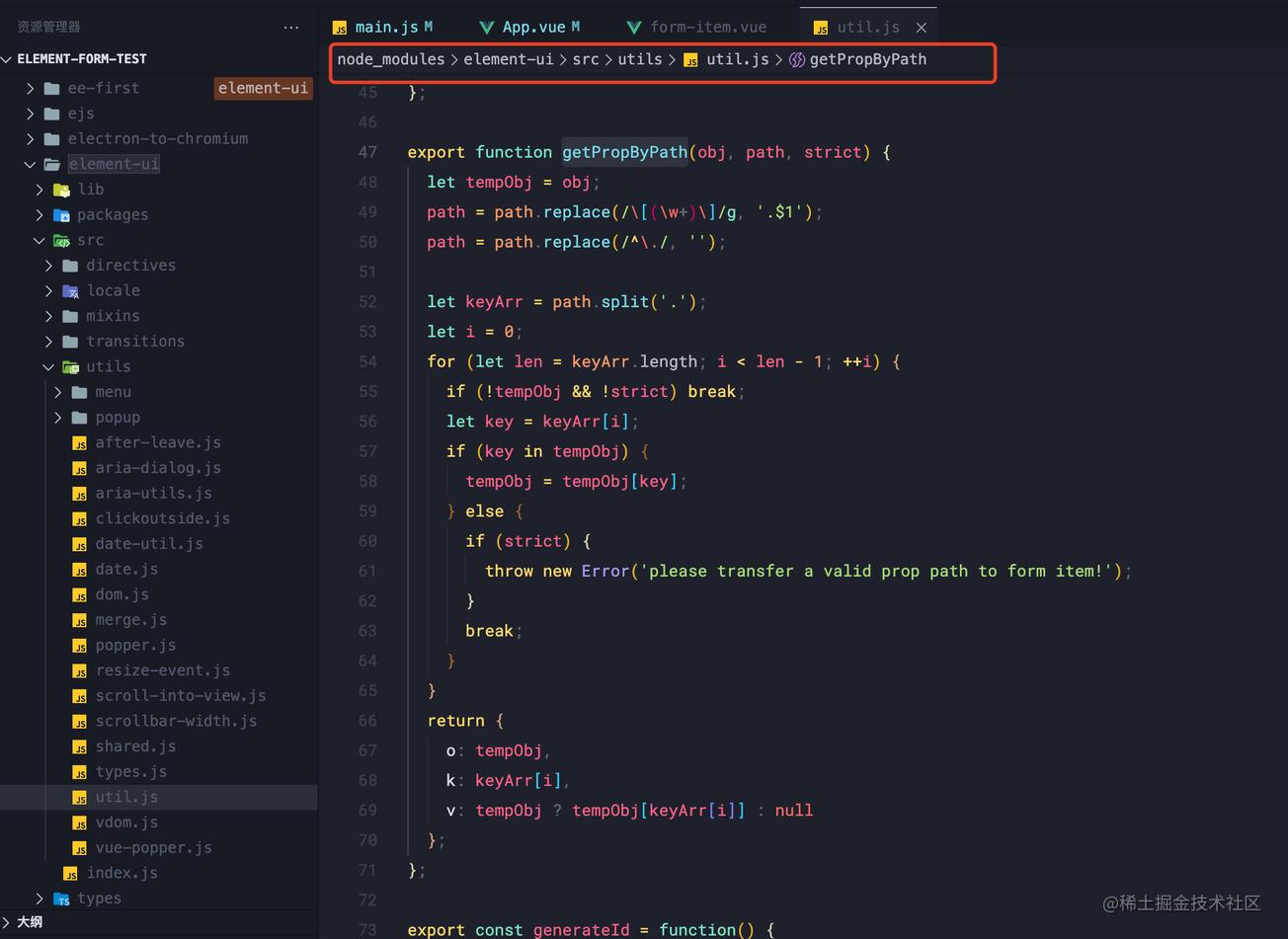 }代码翻到fieldValue这里, 发现这是一个computed属性(步骤见注释), 发现最终返回getPropByPath方法的返回结果, 我们接着去看一下这个方法.