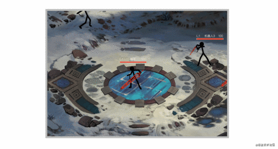 这样一个简单的场景就写好了,接着我们需要在这个场景中加入我们的人物。也就是游戏中的角色。不过游戏贴图实在是太难了,我也没有时间自己去设计,所以直接在网上找了火柴人的gif好像是DNF的技能图,通过PS的处理,截取其中的几个重要动作,加入的到页面中。