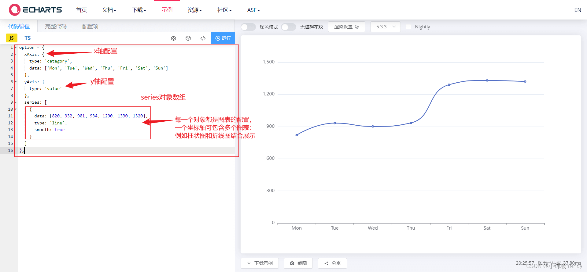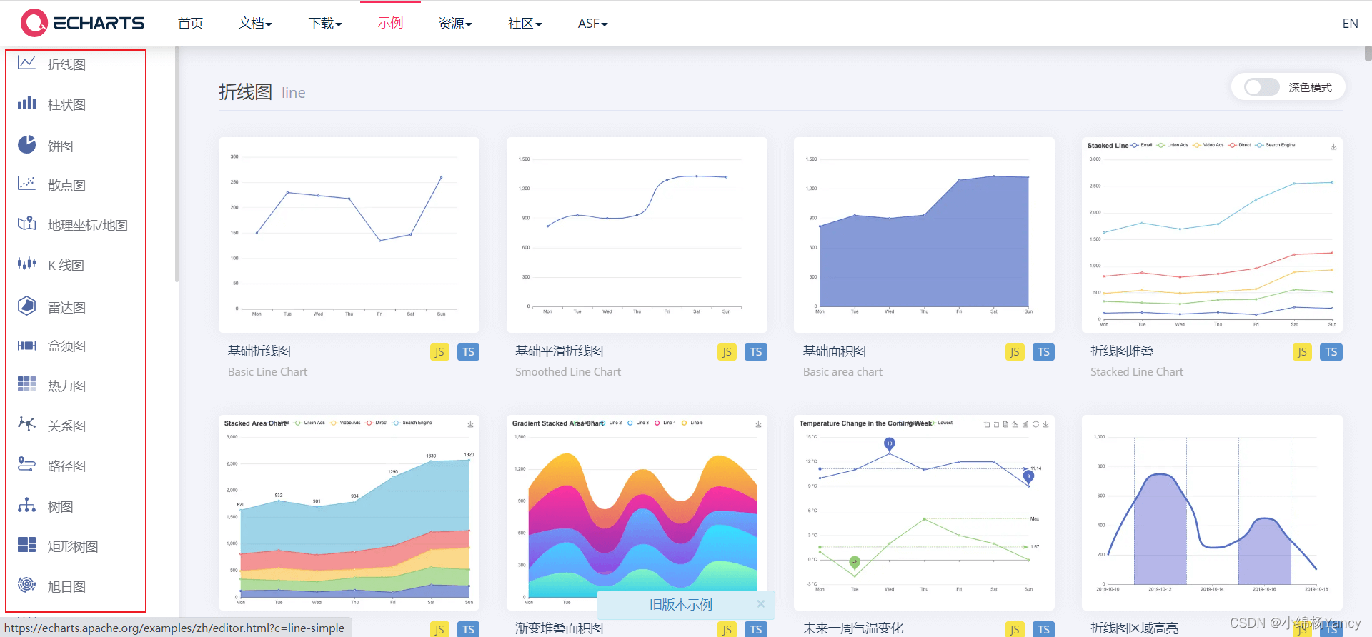 官网有许多图表案例,并且可以直接复制对应的配置代码。