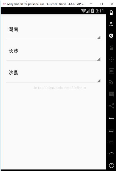 三级联动主要是灵活的应用三维数组,这样能很方便的通过数组索引将三个菜单关联,同时通过设置Spinner的setOnItemSelectedListener来监听选择的动作,动态设置下拉菜单的内容。