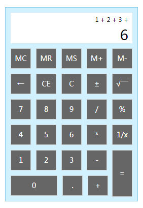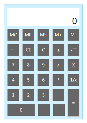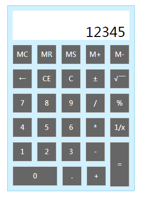 <div class="calculator_wrap" id="calculator"><!--计算器外包元素--> <div class="show_num"><!--显示数字区域--> <div class="num_save" id="numSave"></div><!--计算公式--> <div class="num_cur" id="numCur">0</div><!--计算结果--> <div class="show_m" id="showM">M</div><!--记忆存储标志--> </div> <div class="btn_wrap" id="btnWrap"><!--按钮区域--> <div class="btn" data-key="MC">MC</div><!--记忆清零--> <div class="btn" data-key="MR">MR</div><!--记忆读取--> <div class="btn" data-key="MS">MS</div><!--存储记忆--> <div class="btn" data-key="MA">M </div><!--记忆加--> <div class="btn" data-key="ML">M-</div><!--记忆减--> <div class="btn" data-key="BACK">←</div><!--退格--> <div class="btn" data-key="CE">CE</div><!--清除当前--> <div class="btn" data-key="Clear">C</div><!--清除--> <div class="btn" data-key="Negate">±</div><!--正负转换--> <div class="btn" data-key="Square">√ ̄</div><!--平方根--> <div class="btn" data-key="Num" data-value="7">7</div><!--7--> <div class="btn" data-key="Num" data-value="8">8</div><!--8--> <div class="btn" data-key="Num" data-value="9">9</div><!--9--> <div class="btn" data-key="Base" data-value="/">/</div><!--除--> <div class="btn" data-key="Percentage">%</div><!--百分号--> <div class="btn" data-key="Num" data-value="4">4</div><!--4--> <div class="btn" data-key="Num" data-value="5">5</div><!--5--> <div class="btn" data-key="Num" data-value="6">6</div><!--6--> <div class="btn" data-key="Base" data-value="*">*</div><!--乘--> <div class="btn" data-key="Reciprocal">1/x</div> <!--倒数--> <div class="btn" data-key="Num" data-value="1">1</div><!--1--> <div class="btn" data-key="Num" data-value="2">2</div><!--2--> <div class="btn" data-key="Num" data-value="3">3</div><!--3--> <div class="btn" data-key="Base" data-value="-">-</div><!--减--> <div class="btn equal" data-key="Equal">=</div><!--等于--> <div class="btn zero" data-key="Num" data-value="0">0</div><!--0--> <div class="btn" data-key="Point">.</div><!--小数点--> <div class="btn" data-key="Base" data-value=" "> </div><!--加--> </div> </div>