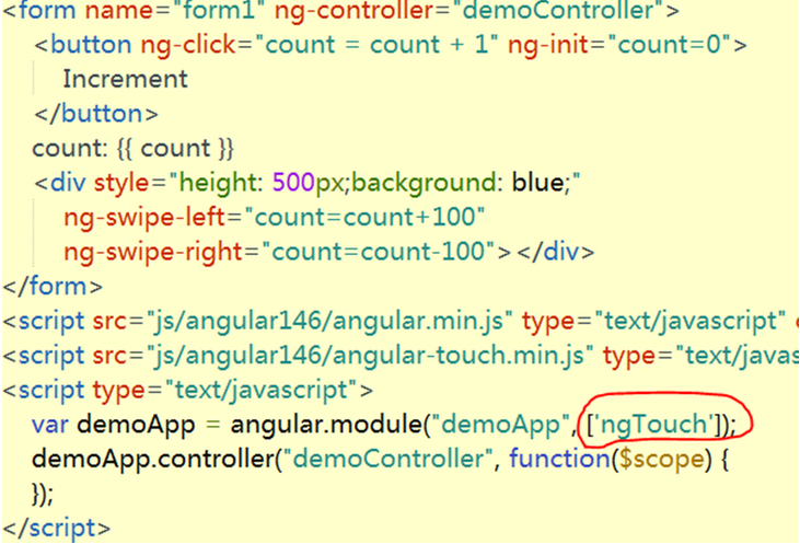 有些特殊的事件需要引入外部模块支持,如ng-swipe-left,首先添加引用: