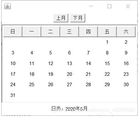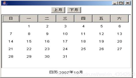 编写一个程序,有一个窗口,该窗口为BorderLayout布局。窗口的中心添加一个Panel容器:pCenter,pCenter的布局是7行7列的GridLayout布局,pCenter的中放置49个标签,用来显示日历。窗口北面添加一个Panel容器pNorth,其布局是FlowLayout布局,pNorth放置两个按钮:nextMonth和previousMonth按钮,单击nextMonth,可以显示当前月的下一个月的日历;单击previousMonth按钮,可以显示当前月的上一个月的日历。窗口的南面添加一个Panel容器pSouth,其布局是FlowLayout布局,pSouth中放置一个标签用来显示一些信息。请完成界面设计和相关功能。运行结果如下图所示。